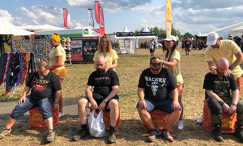 Zurück ins Gelände, durch das sich auffällig viele Rollstuhlfahrer bewegen. Für sie gibt man sich besondere Mühe hier: Es gibt eine eigene Handycap-Infobroschüre, einen separaten behindertengerechten Campingplatz sowie erhöhte Podeste vor den großen Bühnen. 450 bis 500 Rollstuhlfahrer sollen in diesem Jahr dabei gewesen sein, meint Drees Ringert, Inklusionsbeauftragter seit 2016. Seit einem Verkehrsunfall sitzt er selbst im Rollstuhl. Warum wird Inklusion hier so groß geschrieben? Die Community der Metalfans sei „sehr loyal und solidarisch“, weder extremistisch noch rassistisch, erklärt er, das Thema sei eine Herzensangelegenheit, auch der beiden Chefs. Wacken habe hier eine Vorreiterposition eingenommen. Ziel müsse sein, dass alle Festivals inklusiv zugänglich sind. Für nächstes Jahr sei eine Broschüre in leichter Sprache geplant. Seit vorigem Jahr gibt es sogar einen aus Süddeutschland kommenden Pflegedienst, der vor allem bei Morgen- oder Abendroutinen im Einsatz gewesen sei.